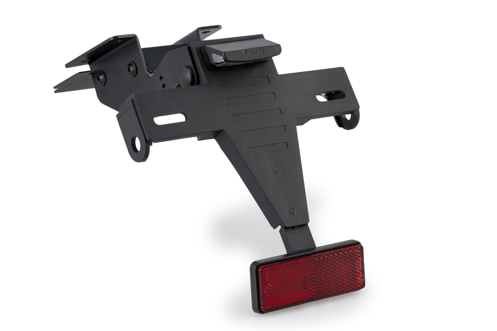 Replace your motorcycle's original license plate holder with the Puig license plate support, which, thanks to its elevated position, provides a sporty look to your bike. The set combines steel parts with an epoxy-painted finish and polyamide elements, achieving a significant weight reduction compared to the original holder.