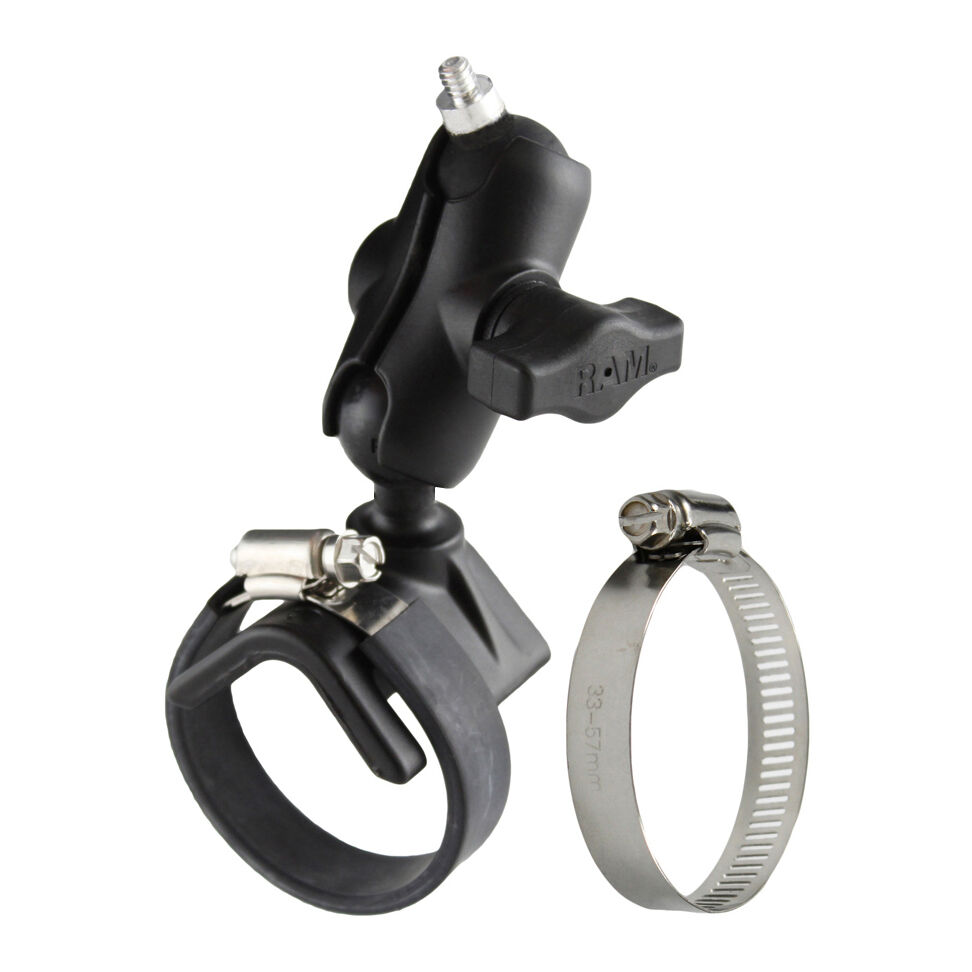 The RAM-B-108B-A-237U consists of a short length B size arm with a 1/4"-20 threaded post and a strap clamp base for rails from 1" to 2.1" in diameter.