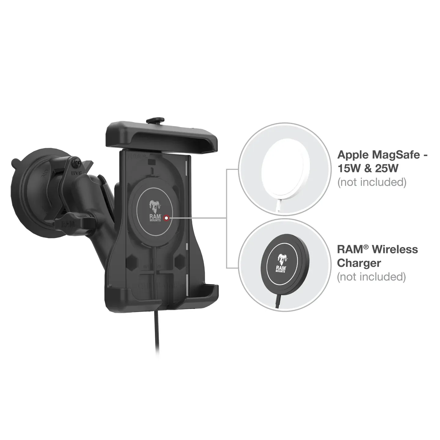Kit includes RAM® Quick-Grip™ Holder for Apple MagSafe Charger, B size diamond ball base, short double socket arm and RAM® Twist-Lock™ suction cup base ideal for vehicle windshields; MagSafe Charger not included