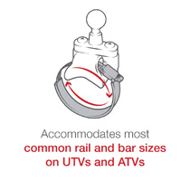 The RAM-B-231-2 consists of a 1" diameter rubber ball connected at right angles to a base that contains a flexible metal strap. The strap base tightening screw is encased in a compact housing for a clean, safe finish. The strap is long enough to wrap around handle bar posts found on most ATV, UTV, Snowmobiles, Motorcycles and any other applications you can think of.