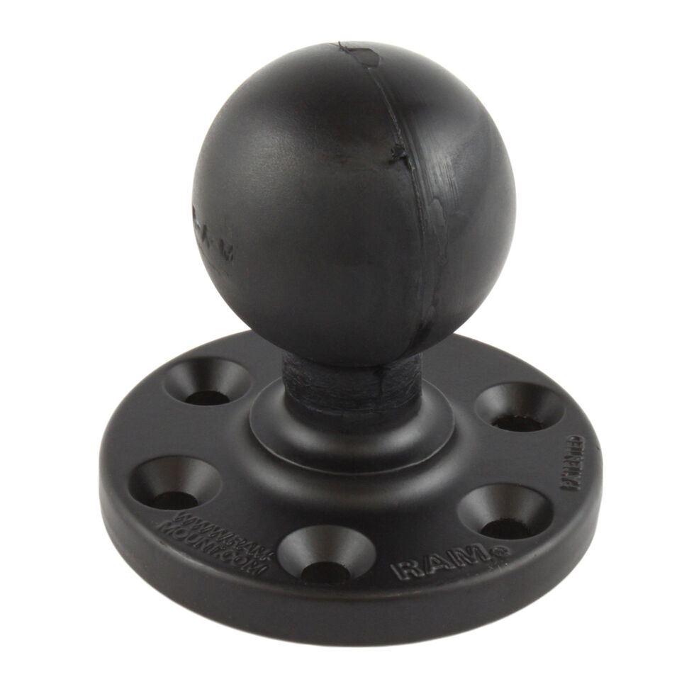 The RAM-D-202U-SYM1 consists of a 2.25" diameter rubber ball, connected at right angles to a 3.68" diameter round base. There are 6 pre-drilled holes in the base.