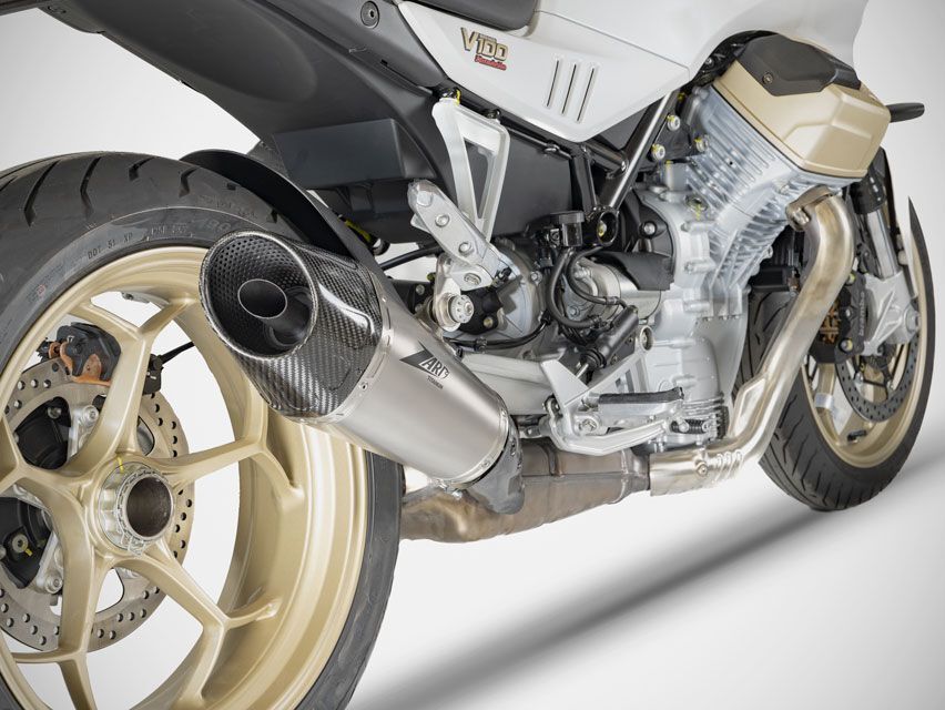 Note: The V100 Mandello slip-on is compatible with original Moto Guzzi® panniers.