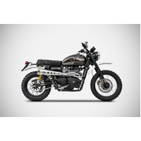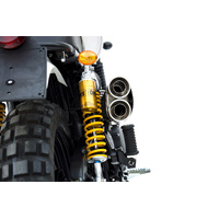 The “Special” high full kit for the Triumph Scrambler 900, entirely handmade in Italy, consists of a header and silencer made of AISI 304 stainless steel, with both sleeve and end cap in stainless steel. It is available in a satin, Cerakote® black finish, or with a black contrasting heat shield. The kit improves the bike’s performance with a significant power increase, a considerable weight reduction of -6.7 kg (-14.8 lbs), bringing it down to just 4.9 kg (10.8 lbs), and delivers a deep, distinctive sound.