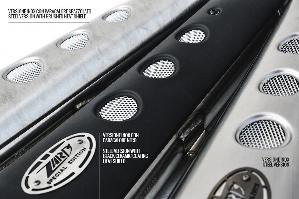 The “Special” high full kit for the Triumph Scrambler 900, entirely handmade in Italy, consists of a header and silencer made of AISI 304 stainless steel, with both sleeve and end cap in stainless steel. It is available in a satin, Cerakote® black finish, or with a black contrasting heat shield. The kit improves the bike’s performance with a significant power increase, a considerable weight reduction of -6.7 kg (-14.8 lbs), bringing it down to just 4.9 kg (10.8 lbs), and delivers a deep, distinctive sound.