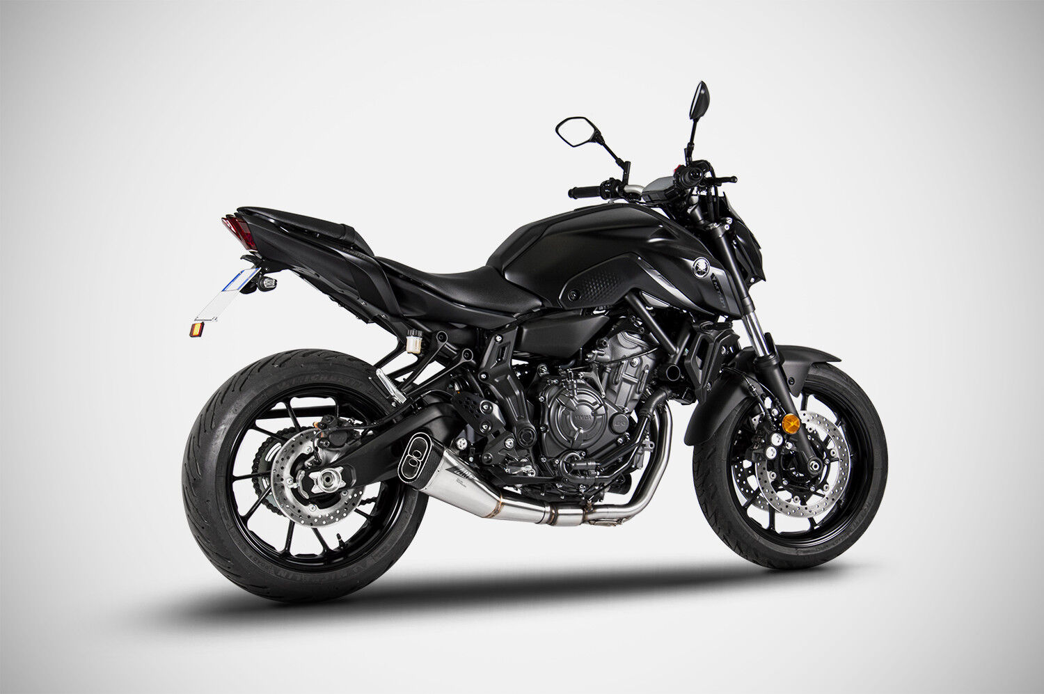 The 2‑in‑1 Full Kit by Zard for the Yamaha MT‑07 is handcrafted in Italy with great attention to detail and performance. The structure is made of AISI 304 stainless steel, with a sleeve in stainless steel, and is available with an end cap in either carbon fiber or stainless steel. The finish is available in either brushed or black ceramic coating.