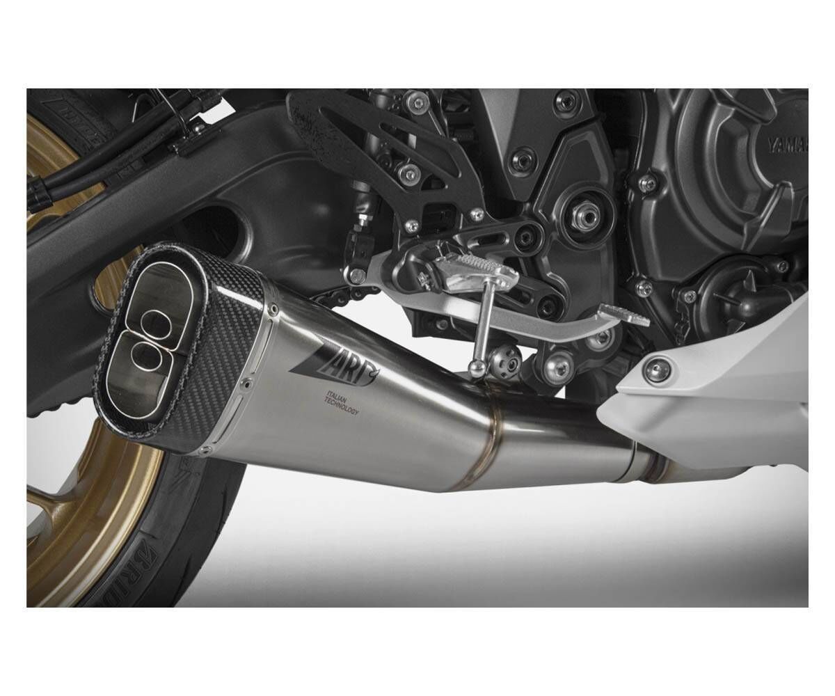 The Zard Racing Full Kit for the Yamaha R7 is designed to deliver maximum performance, reduced weight, and a deep, aggressive sound. The 2>1 configuration, developed specifically for this bike, enhances the R7’s sporty character, improving throttle response and overall riding dynamics. Entirely handcrafted in Italy, the kit features a structure and sleeve in AISI 304 stainless steel, with an end cap available in stainless steel or carbon fiber. Satin or black ceramic coating finish options.