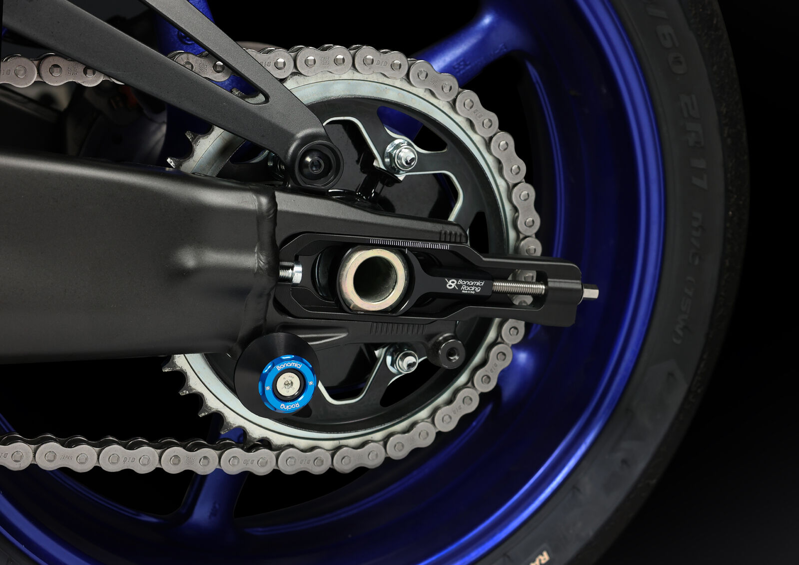 This chain adjuster for the YZF-R9 is an essential upgrade to ensure maximum performance by preventing unwanted slippage and maintaining micrometric adjustment even in extreme riding conditions. With the use of bearings, it completely eliminates friction in sliding points, ensuring smooth and precise adjustments with minimal effort.
