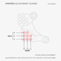 The rearsets are supplied featuring a black anodized finish, aluminum heel guards, racing footpegs, and Adjustable toe pegs using sliding dowels with rubber coating.