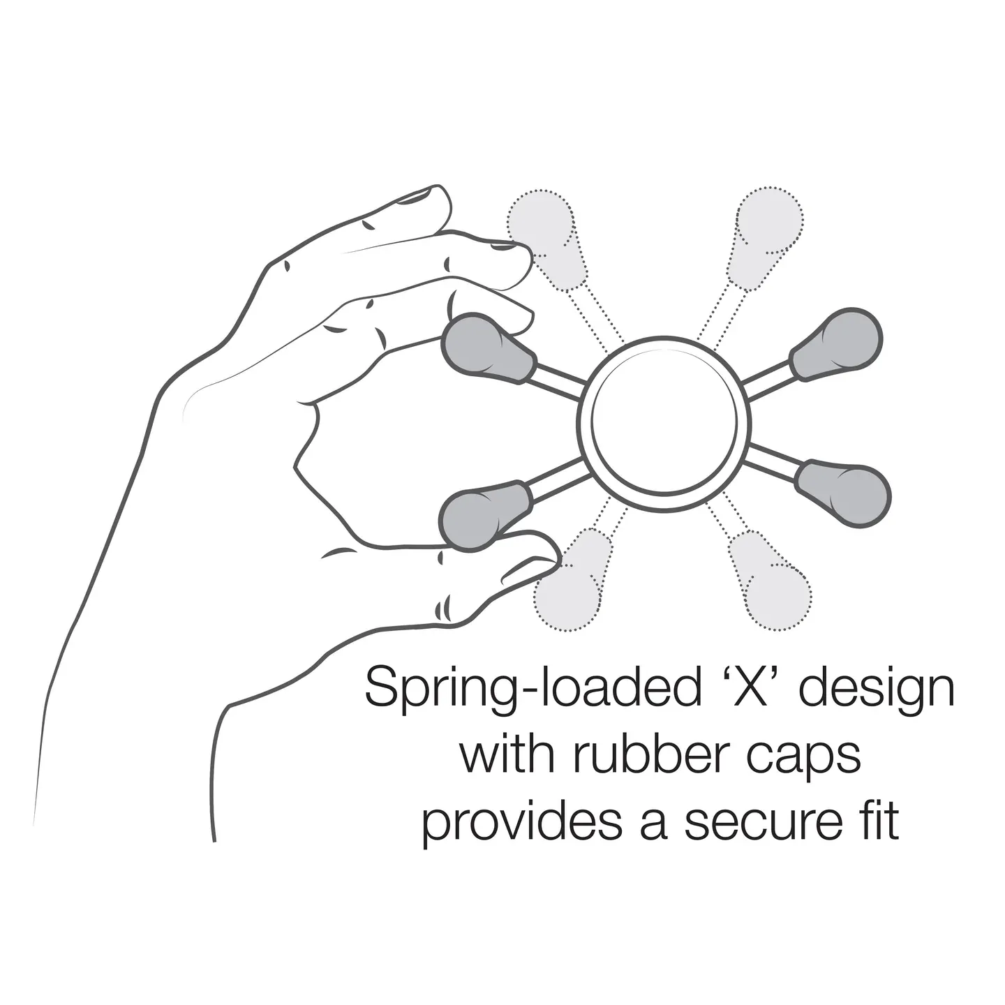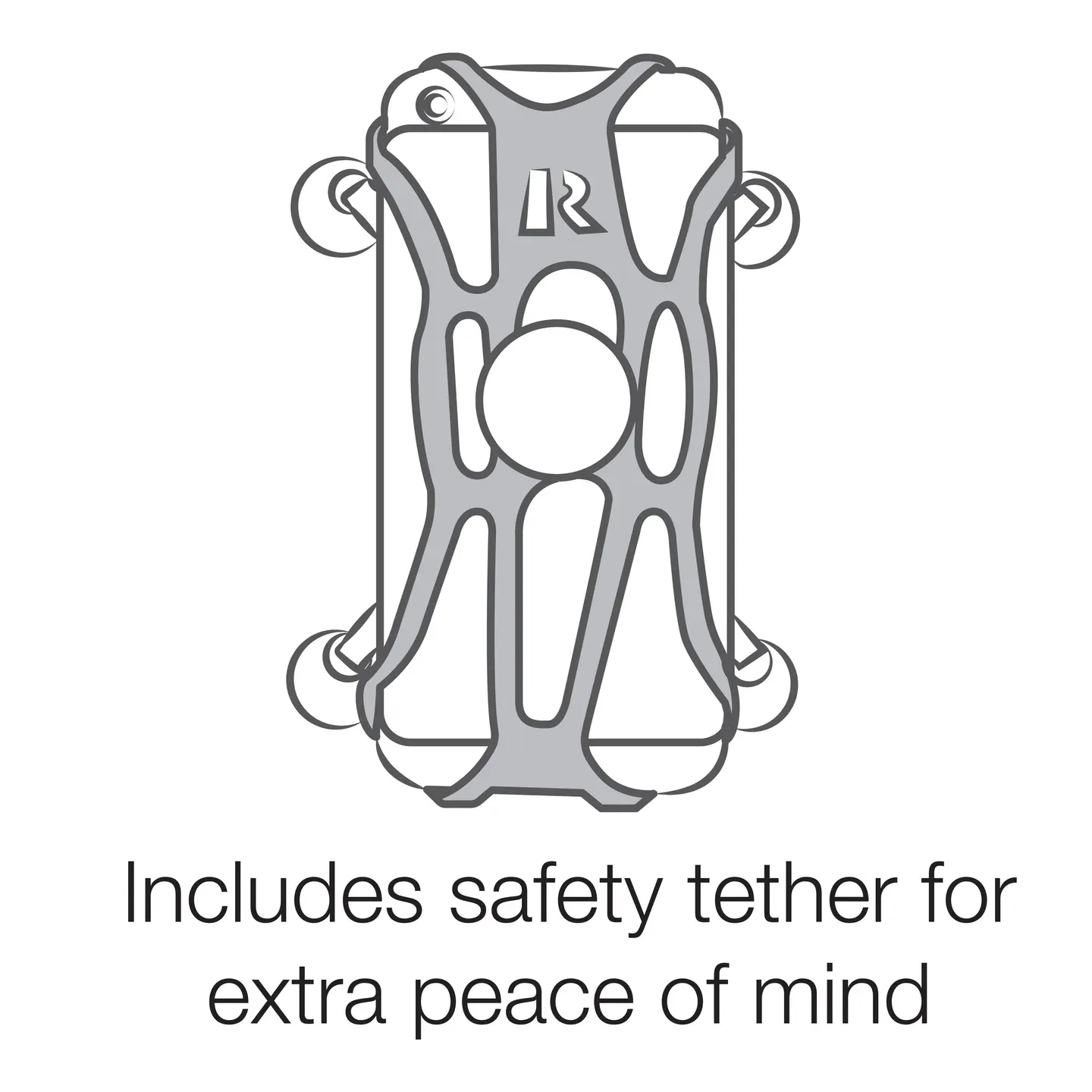 Spring-loaded 'X' design with rubber caps sports great holding power without hiding your phone; includes optional device tether for peace of mind during rugged use