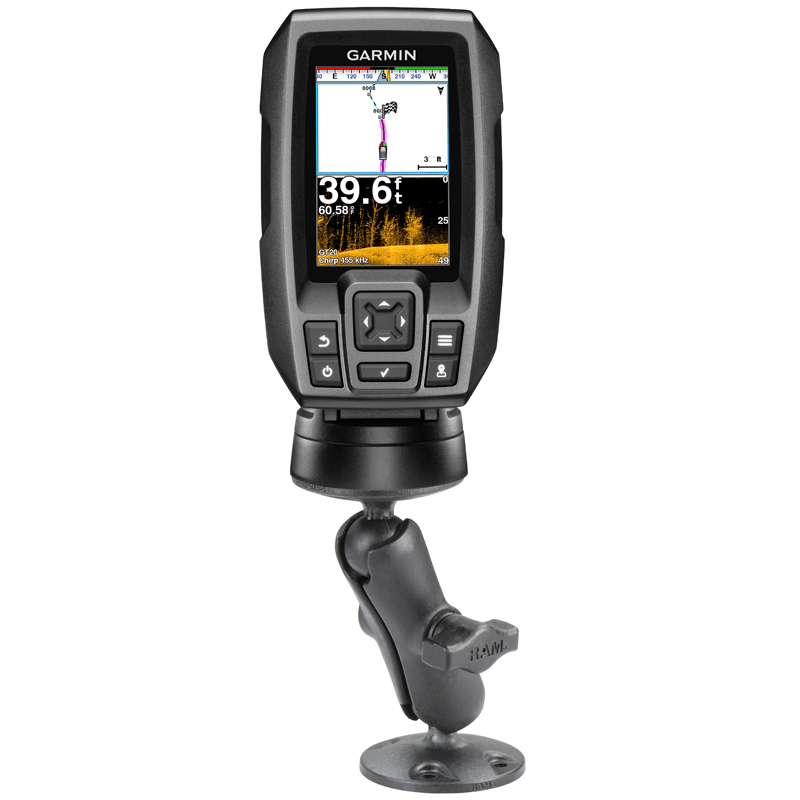 The RAP-B-101U-G4 consists of a 2.5" diameter round base with the universal AMPS hole pattern, double socket arm and round adapter base that attaches directly to the bottom of the Garmin echo™ and Striker™ 4 Series. Designed into the mount is a 1" diameter patented rubber ball and socket system with adjustment points at both socket ends of the arm; this with RAM's rubber ball and socket technology allows for almost infinite adjustment and perfect viewing angles. Included is hardware that is used to attach the Garmin echo™ to the RAM Mount.